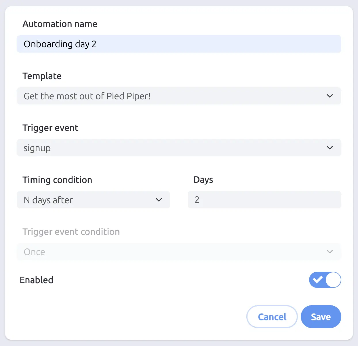 - Enable your automation. Automations are saved as drafts until you toggle the Enabled switch. You can use this toggle to pause and resume automations at any time without deleting them.